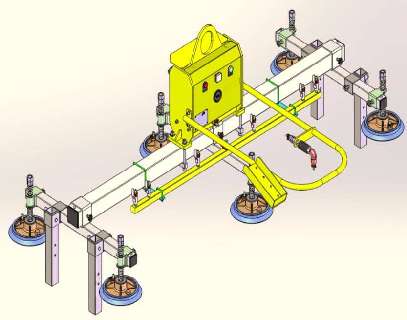 • Spring cushion—- Suction pad rod up and down each be equipped with a spring cushion, When the plate is uneven, The spring effect buffer action,  can make the suction pad strength evenly , so as to ensure suction and lifting the safe and reliable.