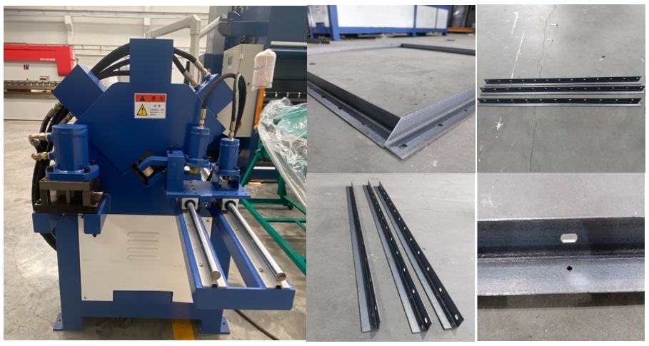 Angle iron flange punching and cutting including total 5 parts: Feeding device, major part, cutting device, hydraulic and electric system. PLC control system can improve accuracy , more effective and lower cost.